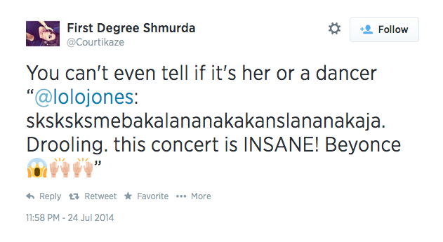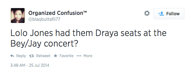 Last night she posted this joke-inciting TwitPic from Beyonce and Jay Z’s “On The Run” tour.