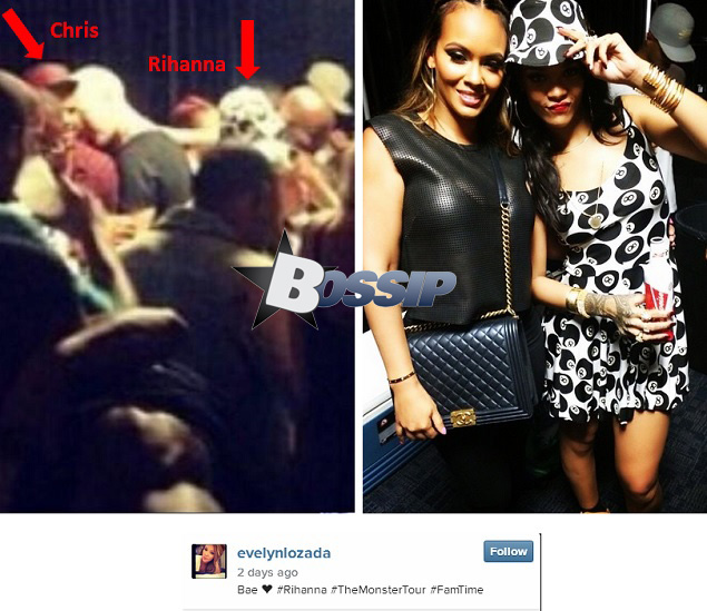 A fan snapped this blurry pic (above left) of Chris also backstage at the concert within arms reach of what appears to be Rihanna, as the person is wearing the same 8-ball ensemble as she is in the pic with Evelyn.