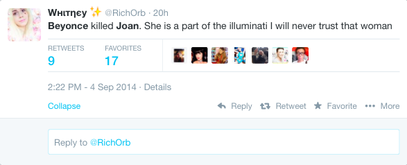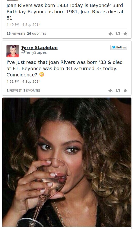So here’s the story: Joan Rivers tweeted a joke about Beyonce. It was her last tweet. Then she died. On Beyonce’s birthday. So guess what? People think Beyonce and the Illuminati had something to do with Joan Rivers dying. Sigh.