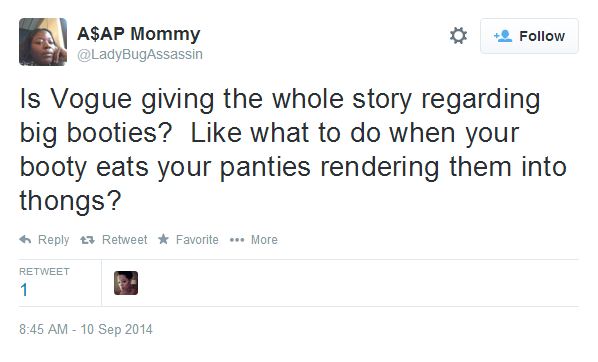 Sistas never get any credit! Premiere fashion Bible VOGUE Mag recently did a piece on the explosion of big booty culture in this country. The magazine goes on to credit Kim Kardashian, Iggy Azalea and Jennifer Lopez for the recent big butt appeal.