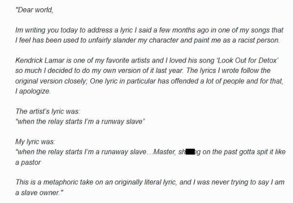 And then there’s that time when she referred to herself as a “runaway slave master” on her song “D.R.U.G.S.” This is her “apology.”