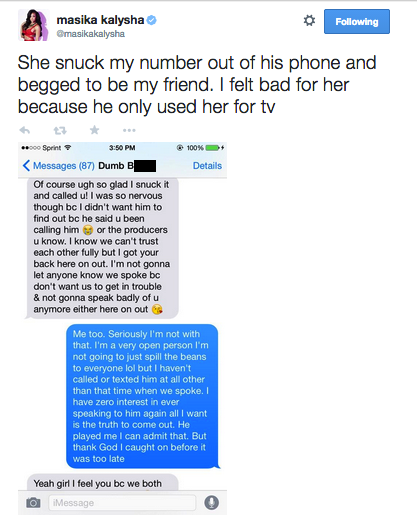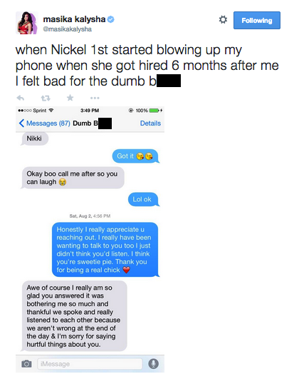 Masika then exposed texts from Nikki clowning Mally behind his back.