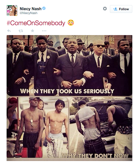 Unfortunately for her, her twitter followers quickly came through to school her and noted that attire is not the issue, but institutionalized racism—the same racism that got Martin Luther King assassinated while wearing a suit.