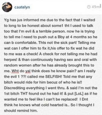 The 24-year-old rapper’s long-time girlfriend Catelyn Spark took to her Instagram page to blasts the “My N*gga” star for offering to pay her off after giving her Herpes, and for continuing to have sex with female groupies despite his prognosis.