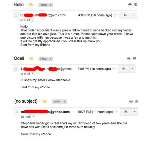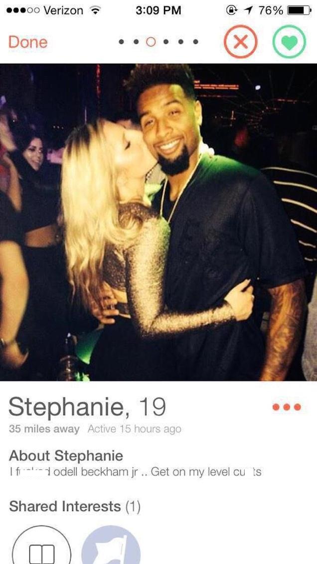 Stephanie is a 19 year old who, like many, joined Tinder. On Tinder, most people post a photo of themselves with a short bio, that they hope will attract people to “swipe right” (or like their page for those who don’t have the app). Stephanie’s photo is one of her giving a grinning Odell a smooch on the cheek. Her bio reads “I f*cked Odell Beckham Jr…..get on my level c*nts”