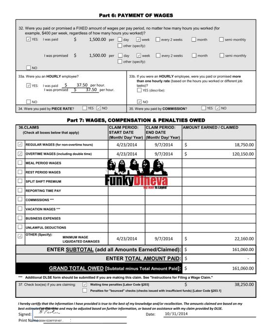 The documents show that the caregiver was was promised 37.50 an hour / 1,500 per week. More so, the final page of the document shows the the nanny is claiming she is due $161,060 in back pay.