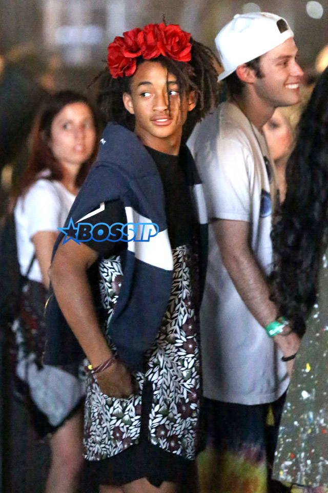 Ya boy Jaden Smith brought his hippie steez to the last weekend of Coachella with this floral headband and tunic. You likey? The tunic may look a lot like a dress but he actually has on shorts underneath.