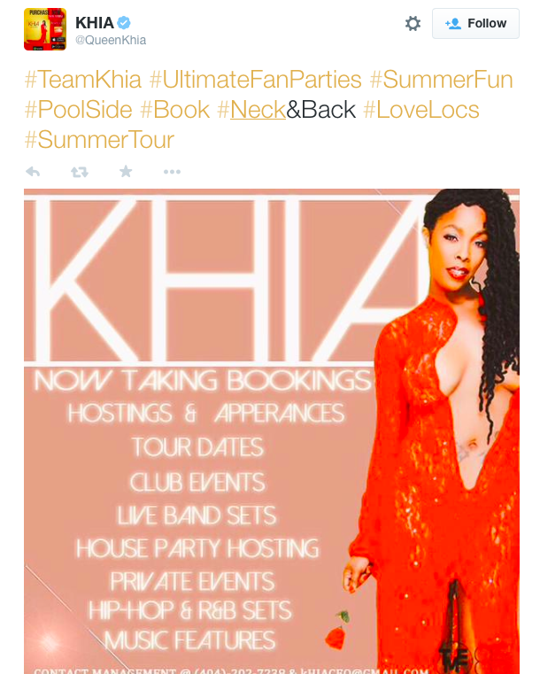 We checked Khia’ booking rates and for $50 on a EBT card and a bag of hot fries she’ll rap to you in the back of your car while you sit in traffic. Would you book Khia?