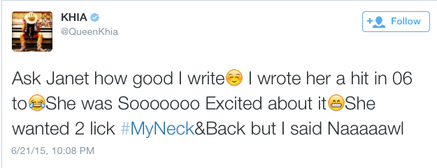 WTF?!!?!?!!?!?!? Janet Jackson did record a song with Khia 6 years ago but we don’t know about the legend wanting to lick Khia’s neck, back and butt-crack. Hit the flip for more…