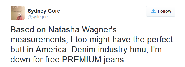 Natasha Wagner wears a “perfect size 6” with a 28-inch waist that’s coveted by the world’s most popular denim brands (7 For All Mankind, Paige Denim, Levi’s, Citizens of Humanity etc) who’ve used her “ideal curves” as the official jean mold for the past 14 years.