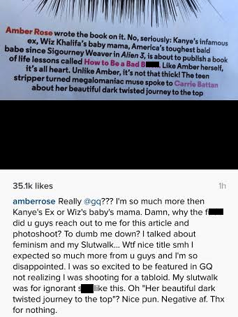 The Slut Walk haver took to IG to blast the mag yesterday for their “Amber Rose: How To Be A Bad B***” piece that she says painted her as only Kanye’s ex and Wiz Khalifa’s baby mama.
