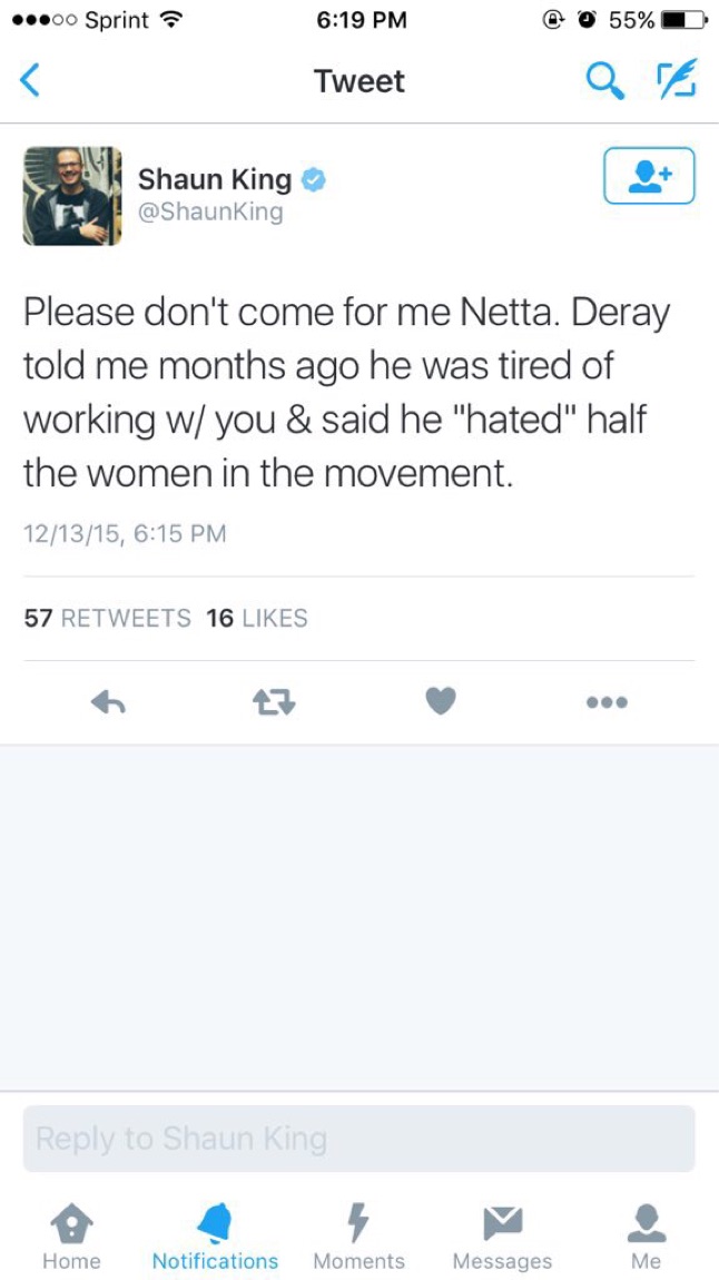 Then there’s the story of Justice Together – and organization headed by King that fell apart under speculation of more money mismanagement. Things came to a head Sunday night when King sent out this tweet aimed at Deray and Netta in defense of his own practices of sharing videos without trigger warnings beforehand.