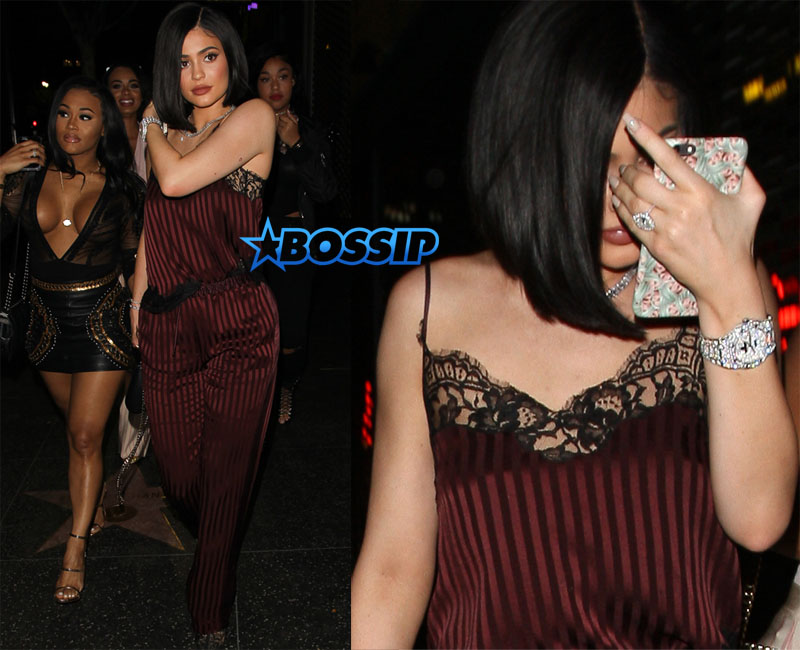 The ladies look nice. Kylie’s been flaunting a huge rock on her left hand, presumably a make up gift from Tyga. Hit the flip more photos from the night and Kylie’s take on the rumor that Tyga’s latest gift he’s bestowed is a baby…
