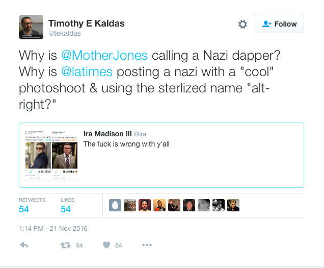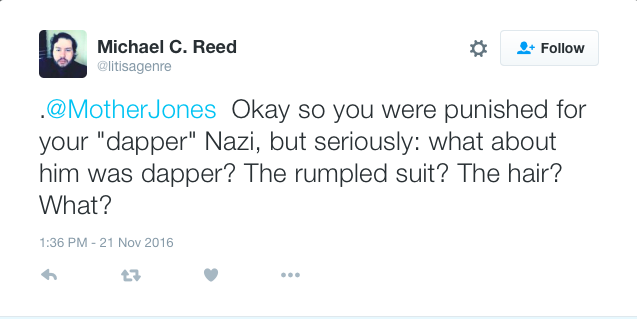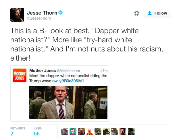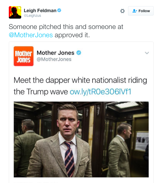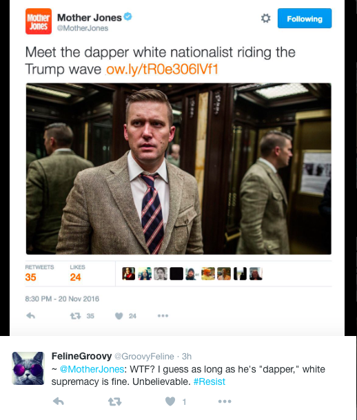 Remember how the media said it would try its hardest to be more critical of Trump and his movement since Election night? Well, while places like Mother Jones have tried their hardest to call out the changing tide in America, it let out one big major fails with one tweet calling white nationalists “dapper.” Dapper? Really?