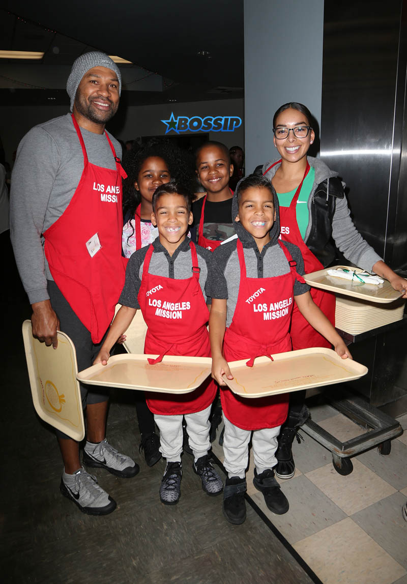 ‘Tis the season to be jolly! Gloria Govan and Derek Fisher and their blended family generously spent Friday afternoon serving meals to the homeless at the Los Angeles Mission Christmas Celebration.