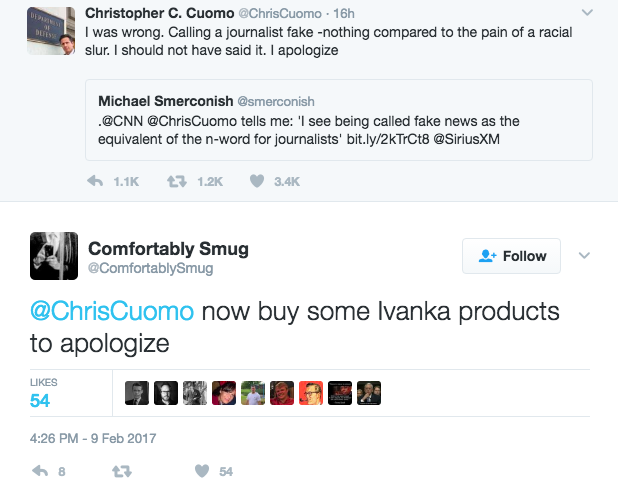 During an interview with Michael Smerconish on SiriusXM radio this week, Cuomo said that he sees being called “fake news” as a journalist “as the equivalent of the n-word for journalists, the equivalent of calling an Italian any of the ugly words that people have for that ethnicity.”