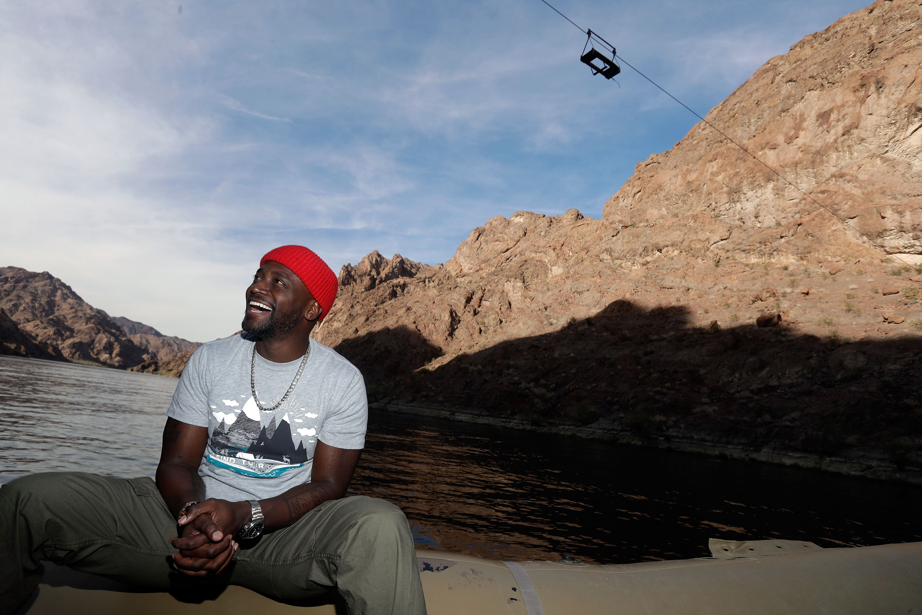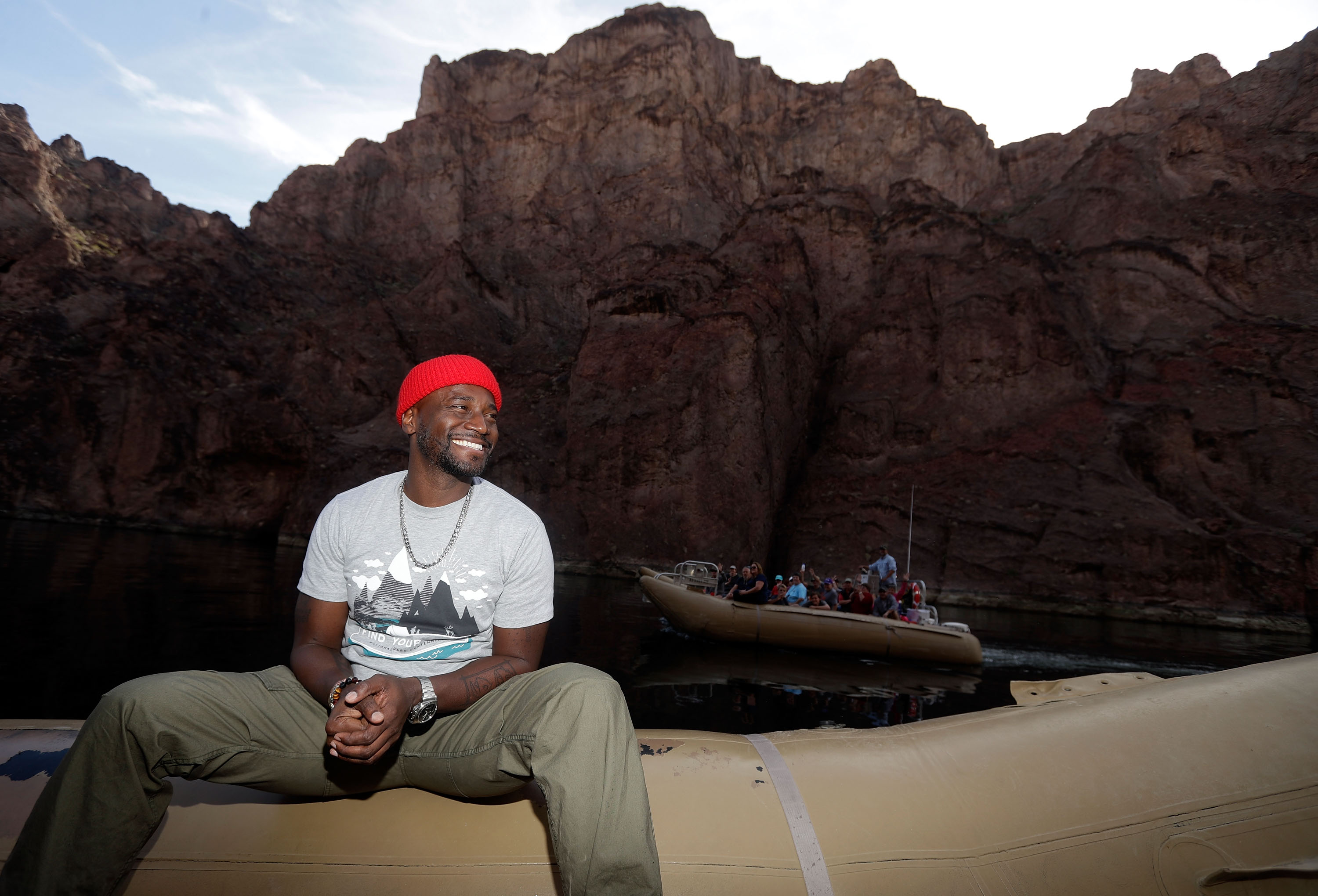 On our adventure southeast of Vegas, Taye and journalists hit high speeds on the Colorado River’s Lake Mead where people sunbathe, swim and water ski while basking in the natural beauty of the U.S.’s largest water reservoir.