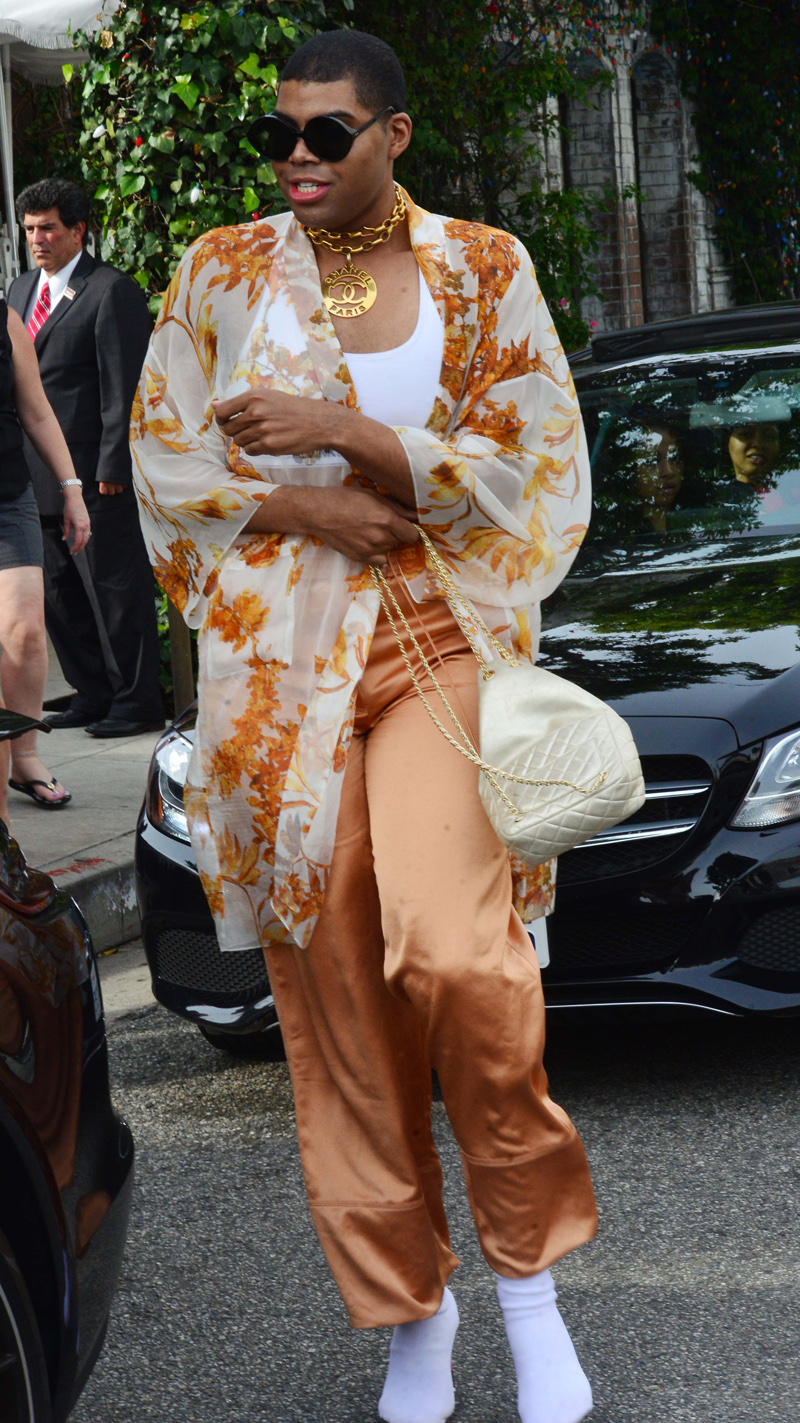 There’s no days off for EJ Johnson when it comes to this fashion game. Magic’s son rocked a white crop top and sherbet satiny pants with a floral kimono and Chanel choker for lunch at The Ivy Saturday.