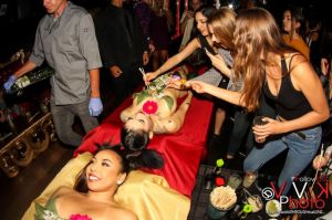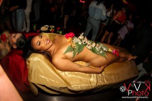 Inside of Murano guests got a chance to experience the “Girls Girls Girls” hallway, where they were surrounded by silhouettes of men and women having sex. Earlier arrivals got a chance to experience a live sex show while devouring sushi off of two naked bodies to the live sounds of hiphop violinist @iamthmpsn.