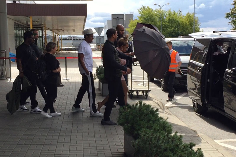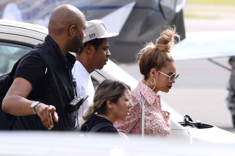 The coupled up Carters were photographed at the airport in Warsaw, Poland Saturday and Beyoncé unleashed some heat on IG — oh just a few casual poses in her romper and topknot.