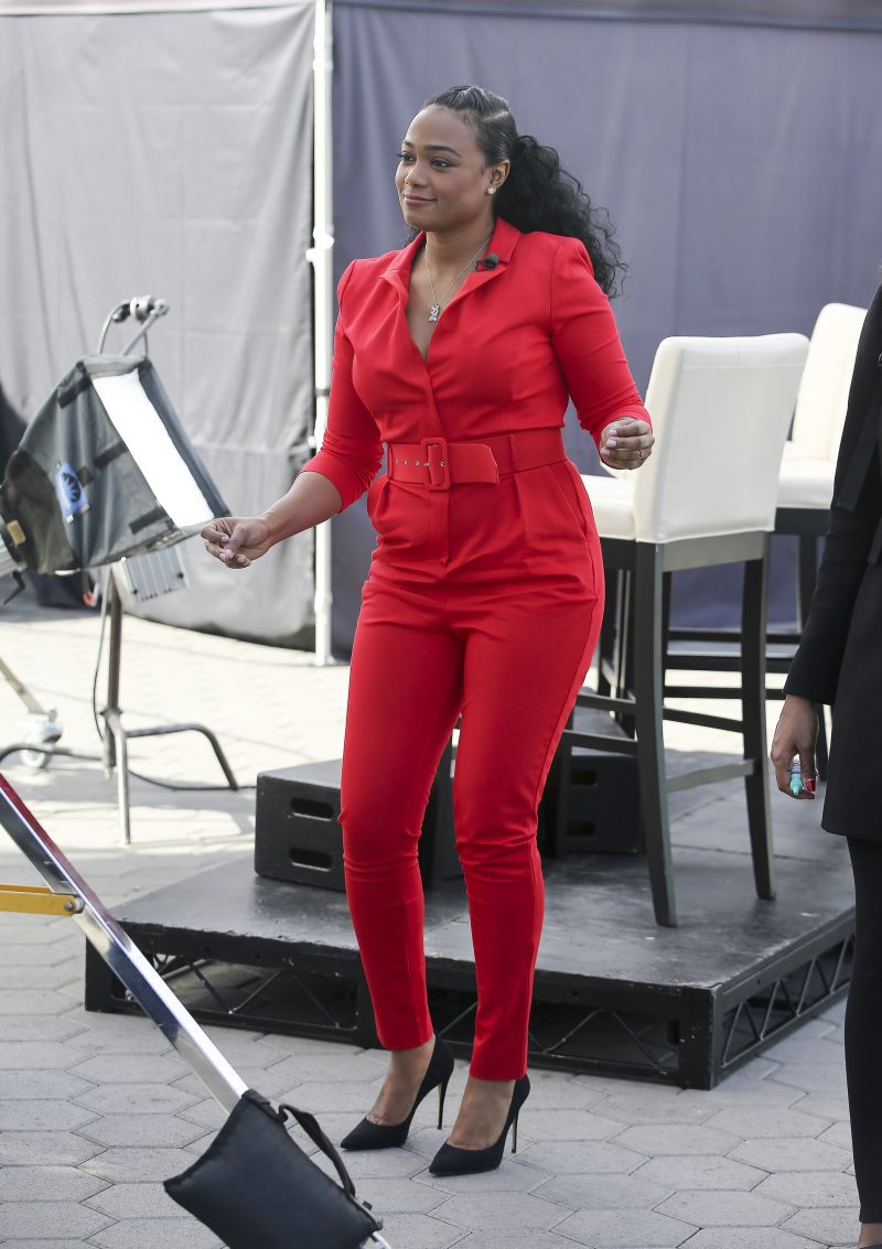 Actress Shows Off Her Shapely Form In Red Jumpsuit At “Extra!” Taping