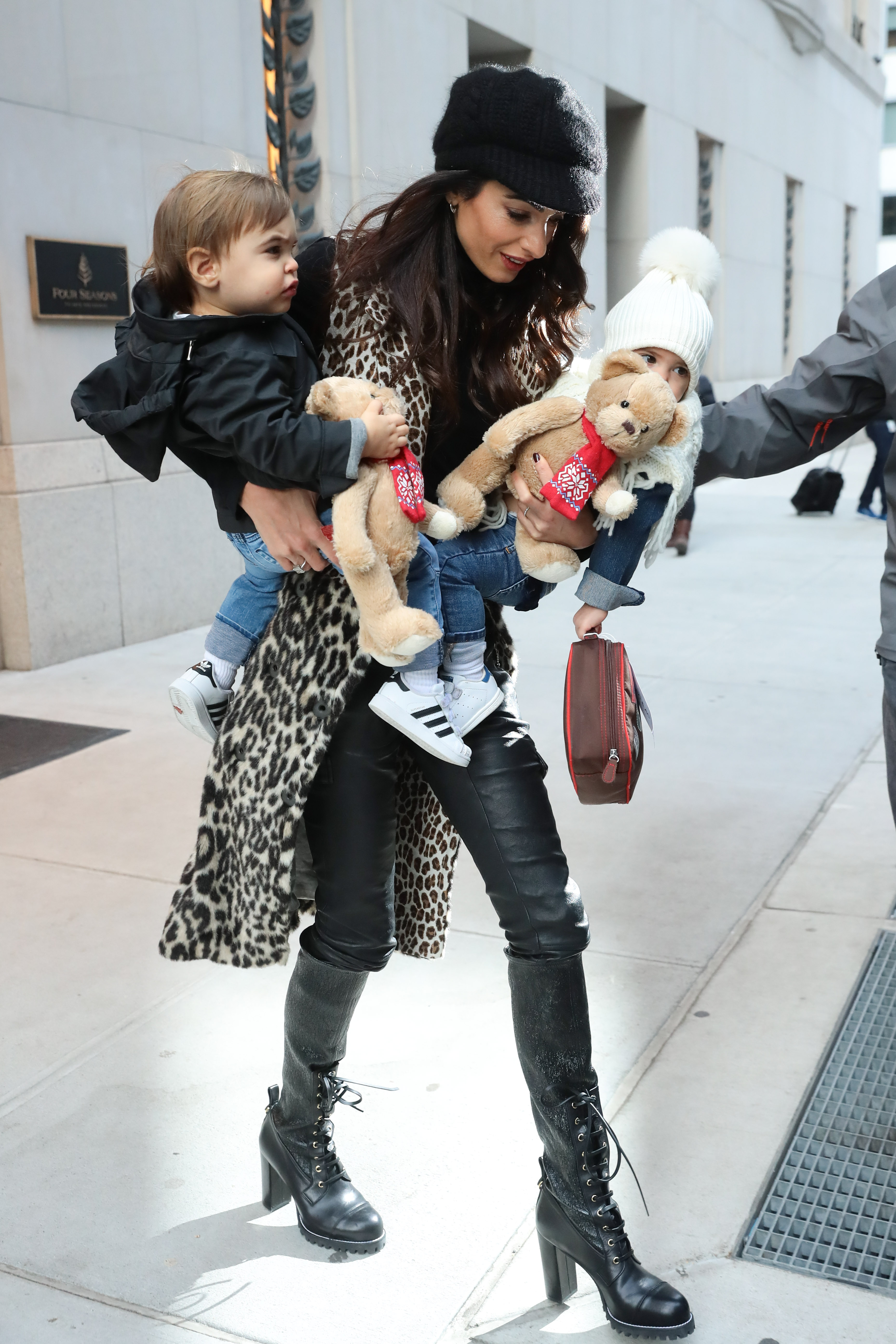 Amal Clooney was spotted with her adorable twins in NYC. The attorney and wife to George Clooney was spotted carrying her children Alexander and Ella who clutched matching teddy bears.