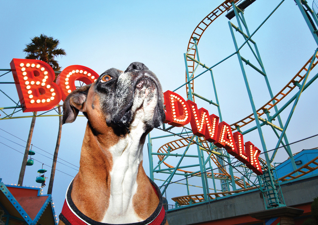 The adorable images show Goldendoodles, Derby and Teddy, each sporting sunglasses and blue mohawks splashing around in the water, Labrador, Fred, catching the waves during a doggy surf lesson and glamourous Chihuahua crosses, Dizzie and Dottie, strutting along the sand in eye-catching bikinis. Other hilarious shots show Boxer, Tom Tom, intently watching the rollercoasters at a seaside amusement park and British Bulldog, Goose, lazily flopped on top of some sandcastles in a Hawaiian style shirt, whilst a gang of canines race towards the sunset.