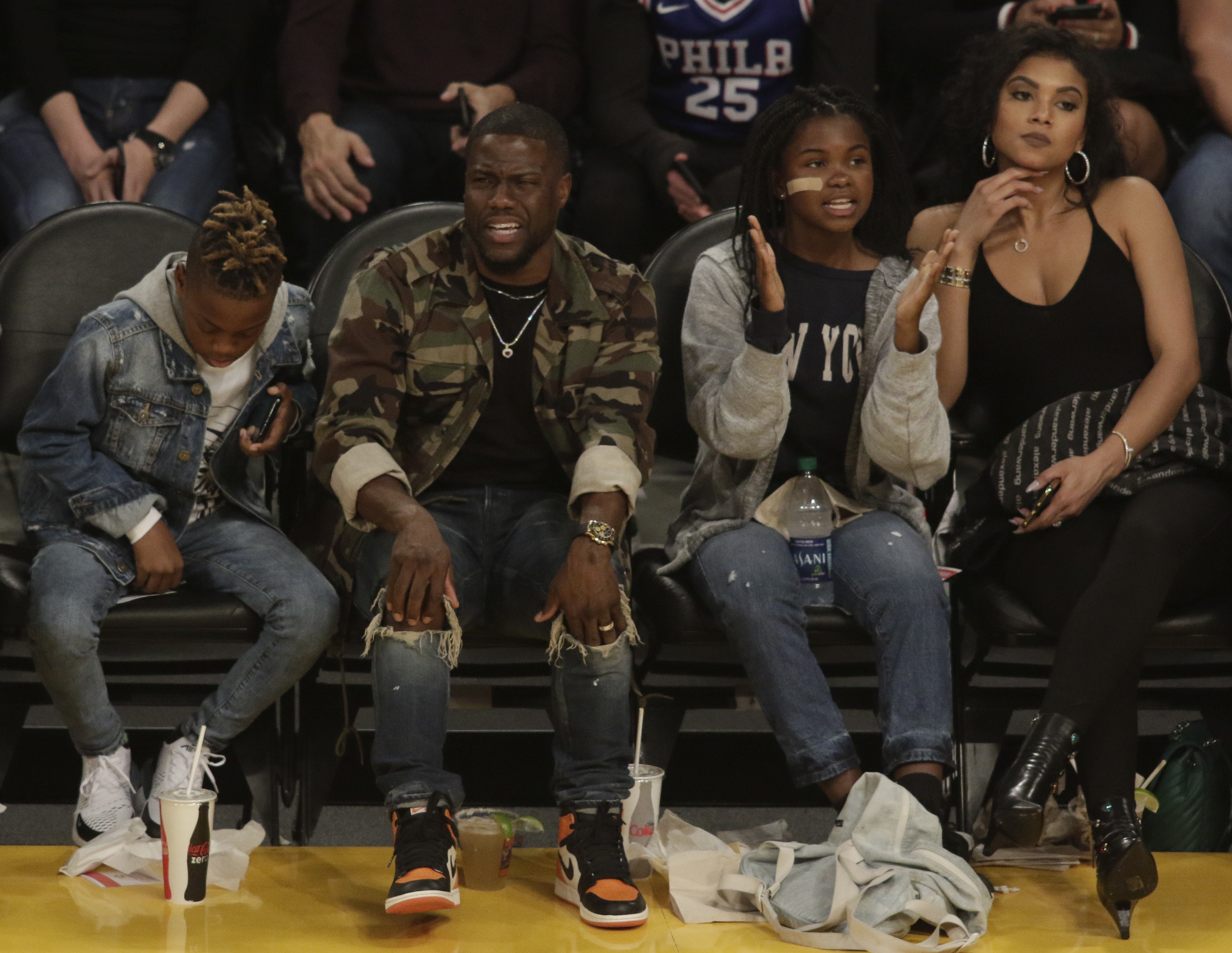 Here’s how you know Kevin Hart’s money is long — he and his wife and his two oldest kids sat courtside to watch the Philadelphia 76ers open up a can of whoop a** on the Los Angeles Lakers Tuesday night. Eniko looks SO happy to be there too.