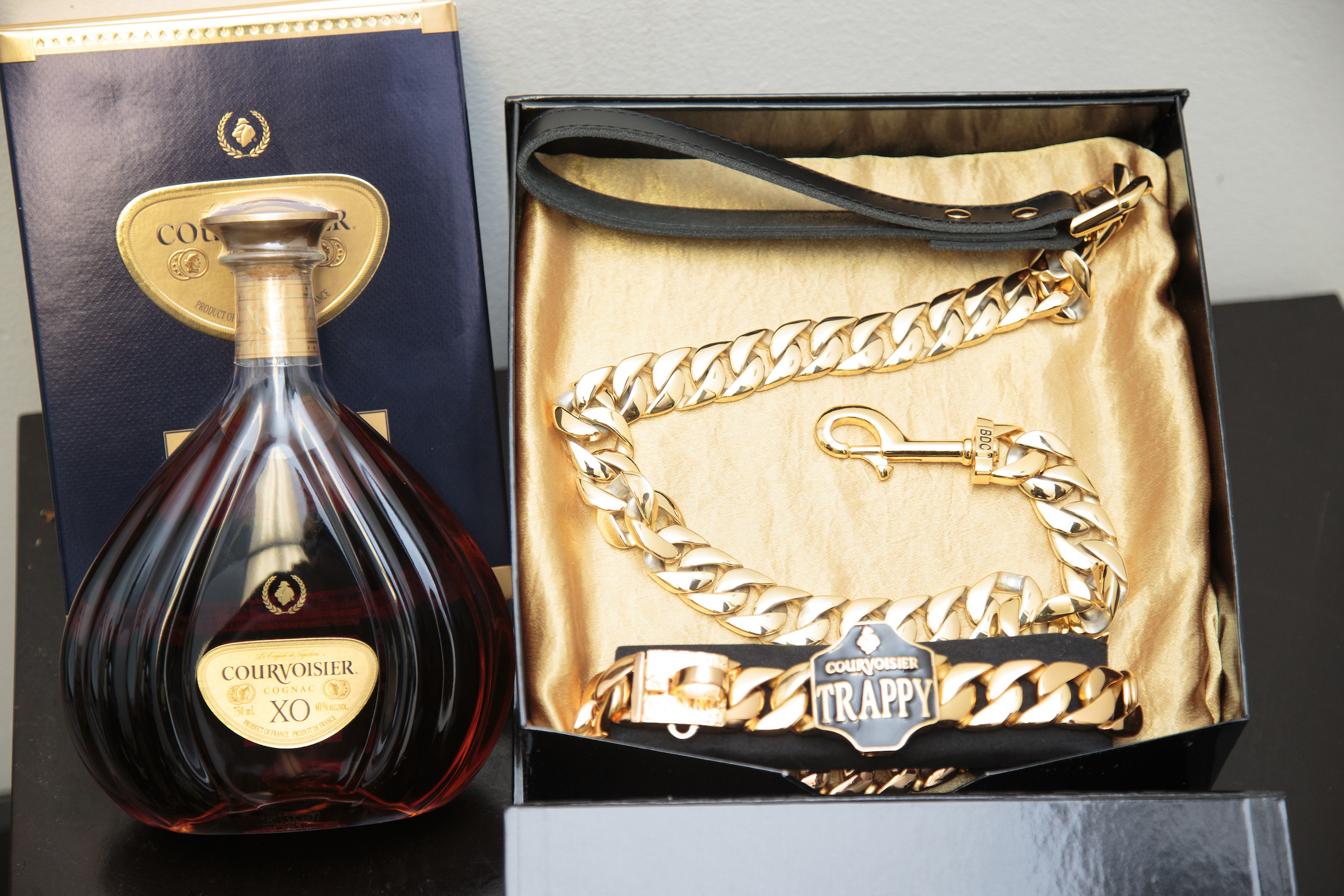 and Courvoisier gifted 2 Chainz’ best friend, Trappy the French bulldog, with a custom gold Cuban link collar.