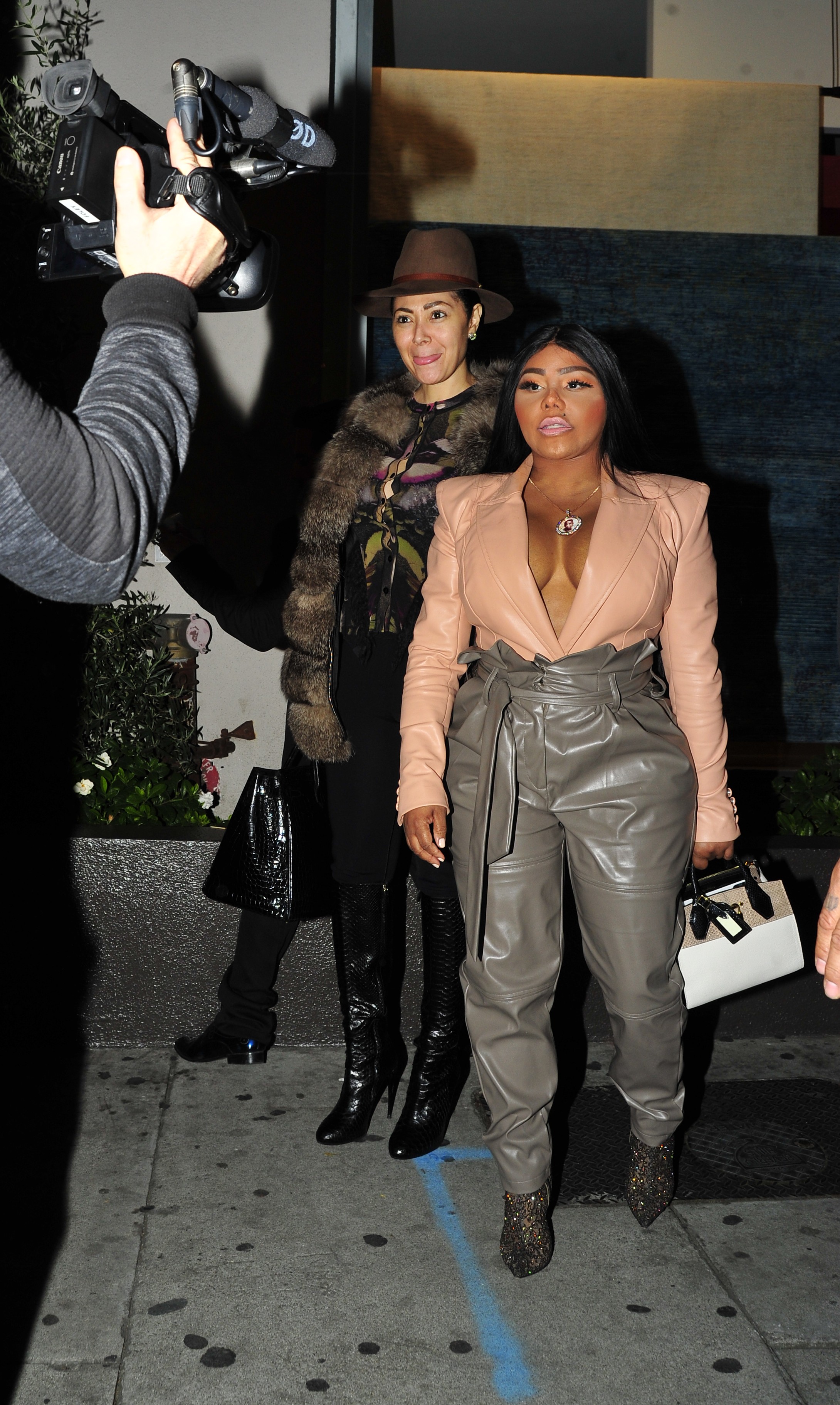 Lil Kim stepped out in Los Angeles Thursday night rocking an all leather look for dinner at West Hollywood hotspot Craig’s. Kim wore a peach leather blouse and gray pants also in the luxury fabric. The rapper complemented her polished look with a pair of Louboutin booties. You like?