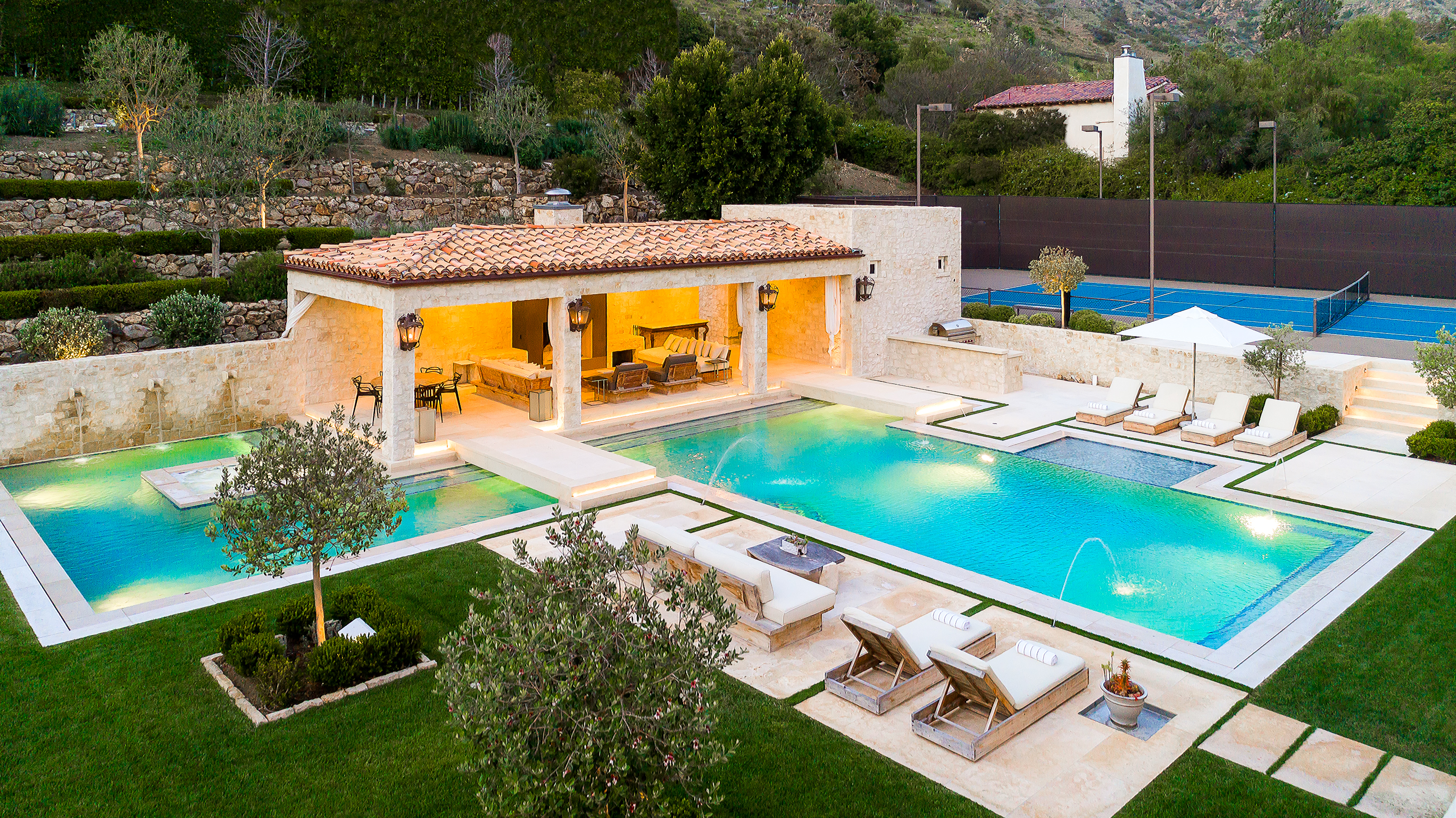The house boasts 8-bedrooms, 10-bathrooms, a gorgeous outdoor pool and patio area, tons of well manicured green space, a tennis court, wine cellar, dance studio and a plush indoor cinema and cocktail area.