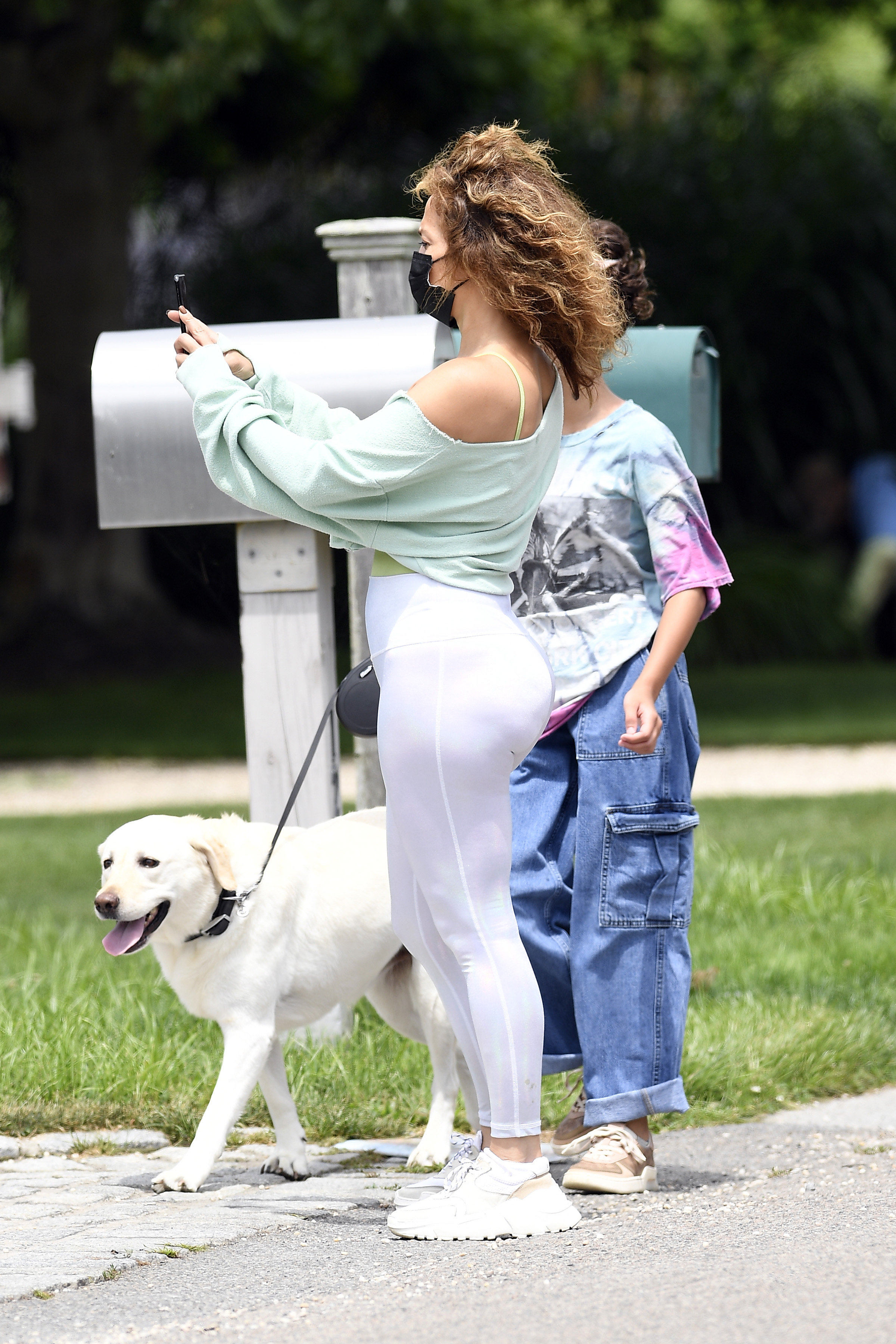 Jennifer Lopez turns 51 tomorrow, on Friday July 24th, but if you didn’t know any better, you wouldn’t guess the Latina Leo was any older than 30, riiiiight?! J.Lo was photographed taking a socially distanced stroll in the Hamptons with her kids Max and Emme and their dogs on Wednesday. The actress / singer / dancer wore an off the shoulder sweatshirt and white leggings for their walk and all three wore black masks to help protect them amid the coronavirus pandemic.