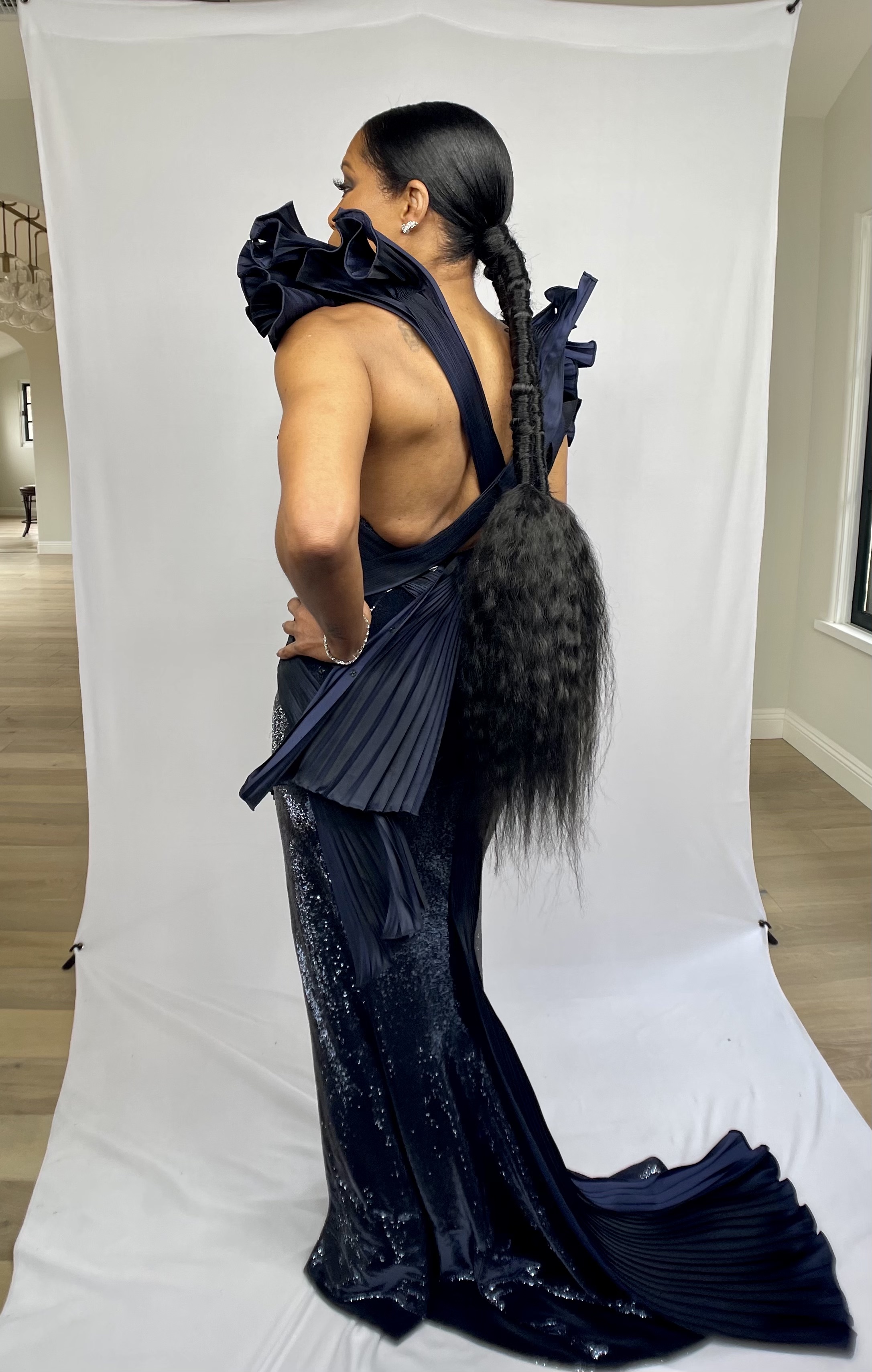 Regina King donned a navy blue Atelier Versace dress and an EPIC Larry Sims-styled double ponytail…