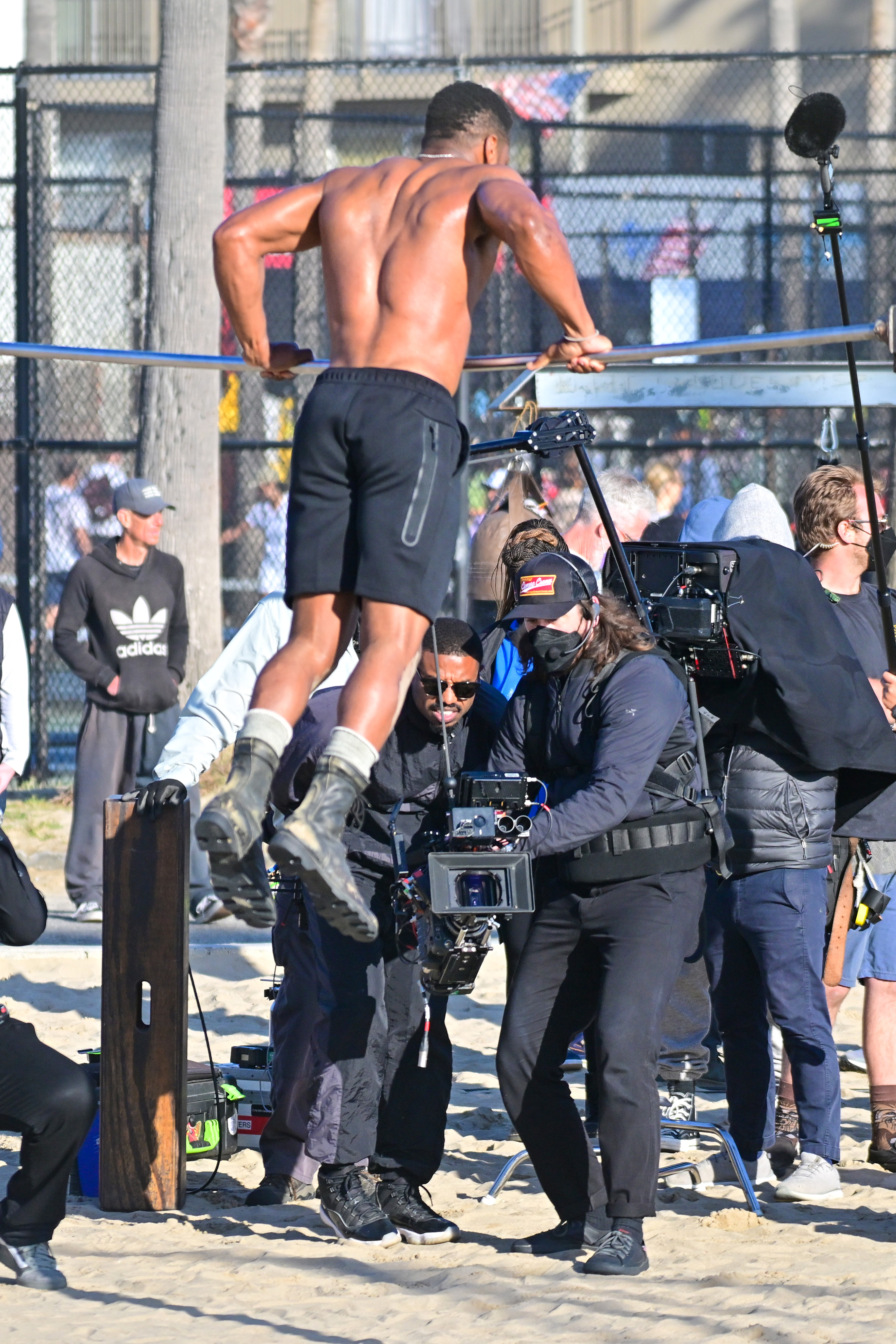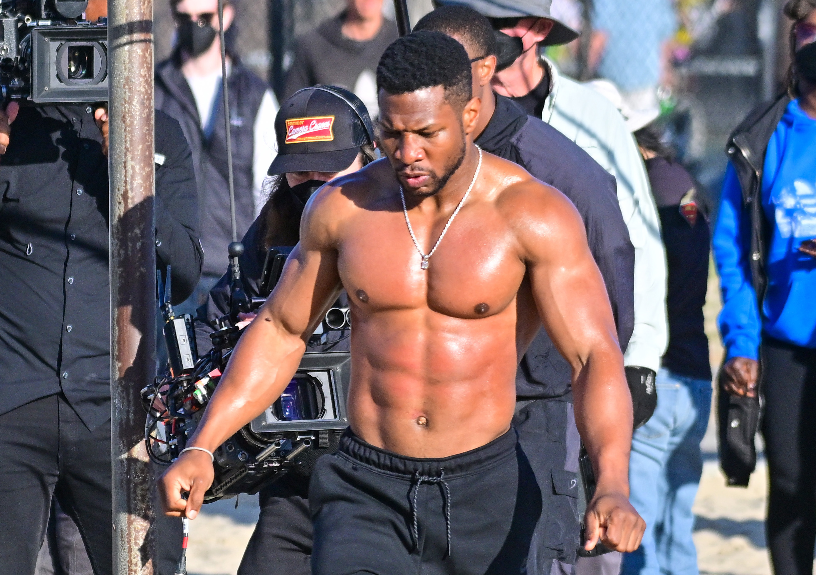 Jonathan Majors is pulverizing panny drawls with his super swole physique captured in ‘Creed III‘ BTS photos from a Venice Beach shoot currently shattering the whole entire internet.