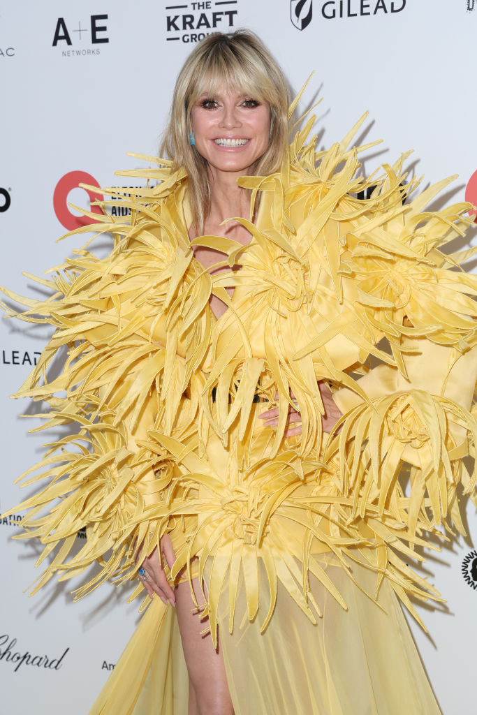 while Heidi Klum turned heads in this yellow feathered creation…
