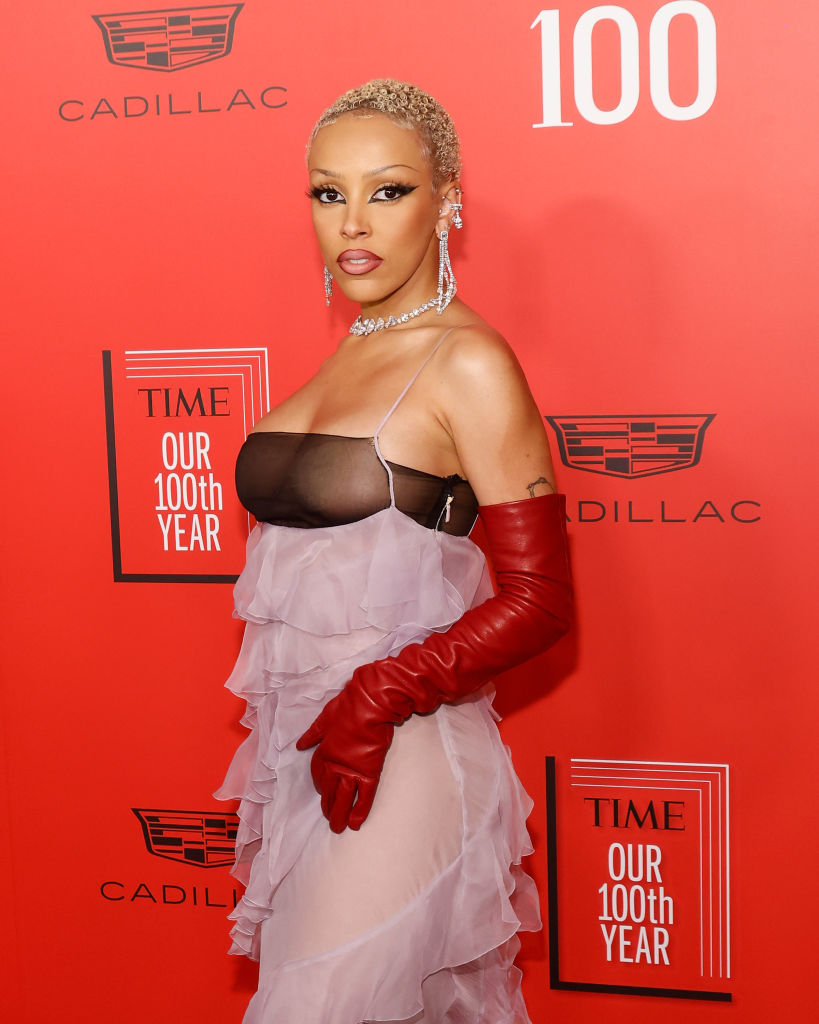 Seen on the scene was Doja Cat who was celebrated in TIME by Elvis director Baz Luhrmann. While on the carpet, she rocked a Valentino dress and accessorized with red leather gloves and diamonds.