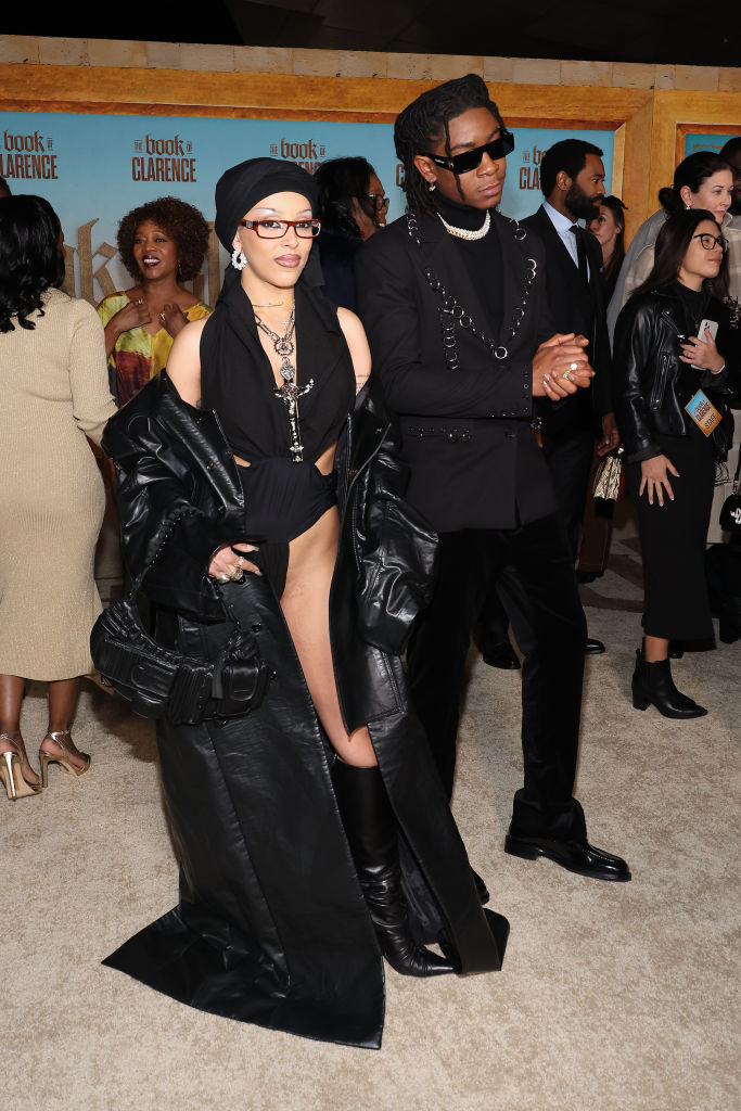 Doja accessorized her look with an oversized trench coat, glasses, and an intricate necklace of Jesus on the cross.