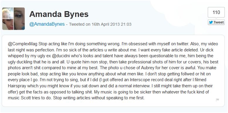 @ComplexMag Stop acting like I’m doing something wrong. I’m obsessed with myself on twitter. Also, my video last night was perfection. I’m so sick of the articles u write about me. I want every fake article deleted. Ur d**k whipped by my ugly ex [Kid Cudi] who’s looks and talent have always been questionable to me, him being the ugly duckling that he is and all. U quote him non stop, then take professional shots of him for ur covers, his best photos aren’t shit compared to mine at my best. The photo u chose of [Drake] for her cover is awful. You make people look bad, stop acting like you know anything about what men like. I don’t stop getting followed or hit on every place I go. I’m not trying to sing, but if I did (I got offered an Interscope record deal right after I filmed Hairspray which you might know if you sat down and did a normal interview. I still might take them up on their offer) get the facts as opposed to talking sh*t. My music is going to be sicker then whatever the f**k kind of music Scott tries to do.