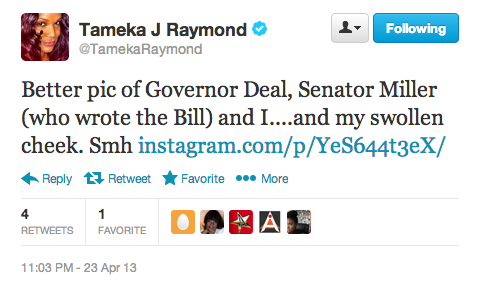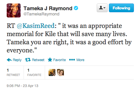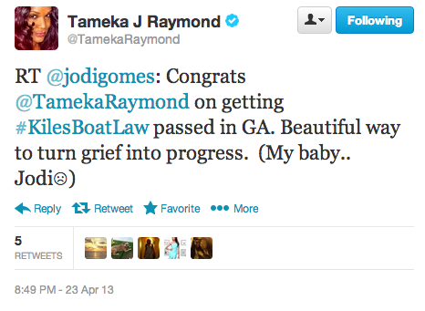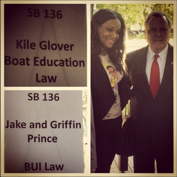 Although she had previously vowed never to return to the popular vacation area, Tameka made an appearance to celebrate the passing of the Kile Glover boating education law, along with Georgia lawmakers and Tara Prince, the mother of Jake and Griffin Prince who lost two sons just weeks before Glovers death. The Prince boys are also being memorialized with the new piece of legislation. They were killed after a drunk boater struck their craft.