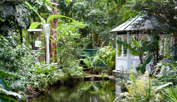 The lovebirds, who live down the street, were married on the edge of the historic hotel’s natural-water pools, where guests can swim with pond fish.