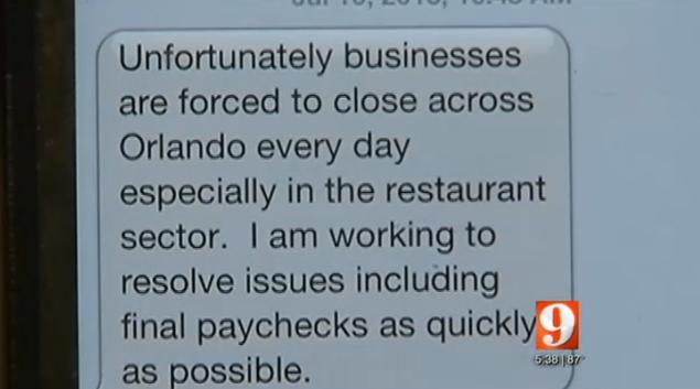 That was the message — text message, actually — a group of Florida restaurant employees got from a restaurant owner July 4th when he told them the business was closed.