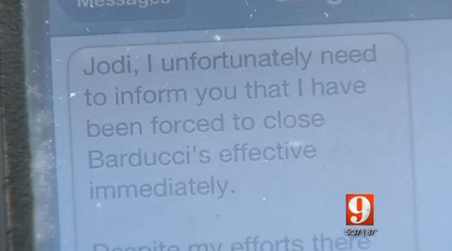 “Jodi, I unfortunately need to inform you that i have been forced to close Barducci’s effective immediately,” Kennedy wrote via text.