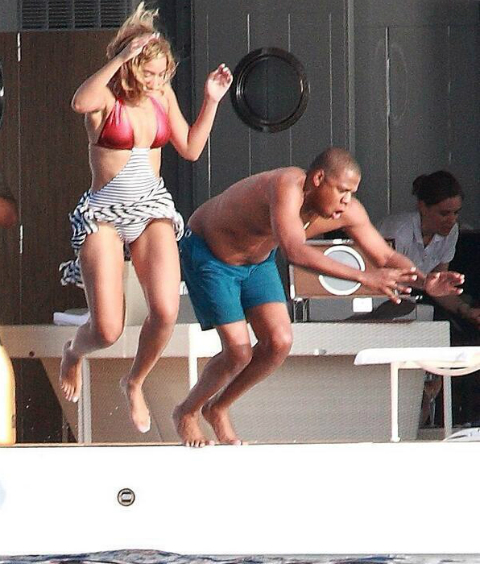 Hov looking every shade of gray and ALL of 43 while belly flopping into the water with Bey Bey. [bossip_ad_a]