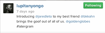 We’ve got our eyes on you… You’re everything that we see. We want your hot love and devotion, endlessly. But no, seriously. Jared Leto and Lupita Nyong’o have been displaying some real on camera chemistry in their many interactions since the Hollywood Award season kicked off… They can’t seem to stay away from one another, whether it’s on the red carpet, at after-parties or even onstage presenting and accepting awards. And the two incredibly attractive actors have fans of “The Swirl” clamoring to get it on already and even make some swirly babies!