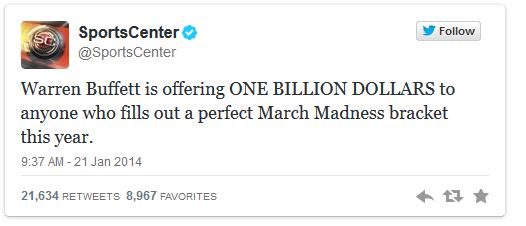 Warren Buffett‘s Berkshire Hathaway and Dan Gilbert’s Quicken Loans are partnering to award $1 billion to anyone who fills out a perfect 2014 Men’s NCAA Tournament bracket.