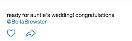 Brewster’s older sister, Fast & Furious star Jordana Brewster, posted about the big day on her Twitter and WhoSay accounts. “Ready for auntie’s wedding!” she captioned a sweet photo of herself with son Julian, 4 months, in a little tux. “Congratulations @BellaBrewster.”