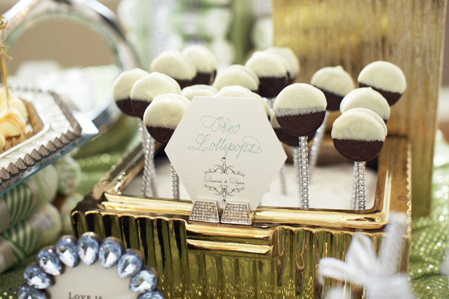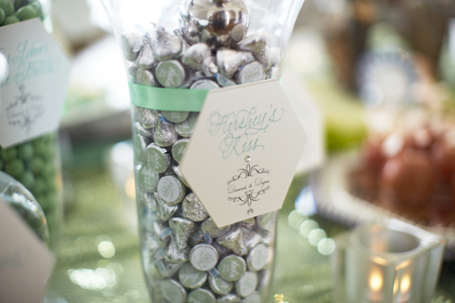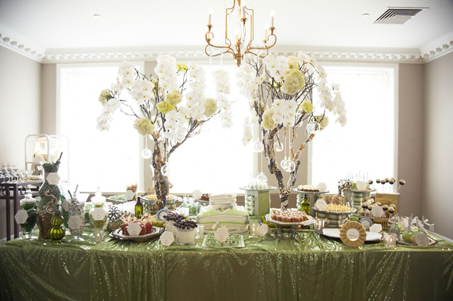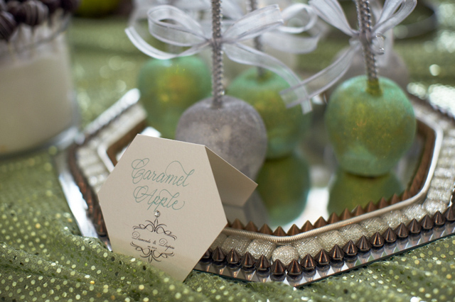 The dessert room was laced with big beautiful jeweled trees filled with bright white orchids, hanging glass balls, candles and diamonds. The dessert table was covered with blinged out candy apples, cake pops, personalized Hershey Chocolate Bars and a yummy candy bar provided by Sugarfina of Beverly Hills. Guests dined on a full food buffet of sliders, mini crab cakes, sushi, and much more!