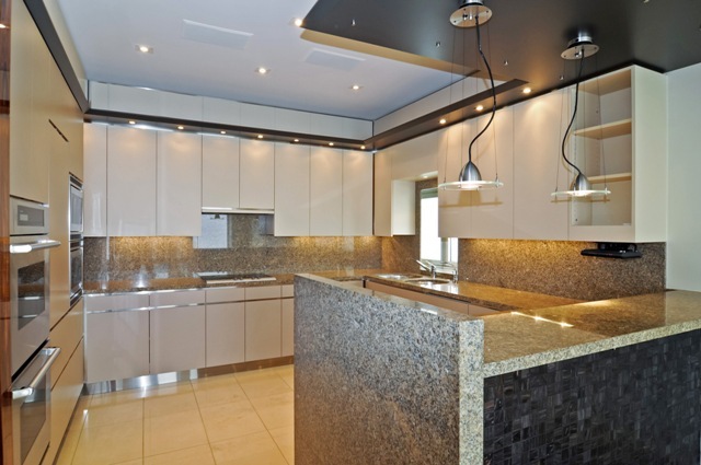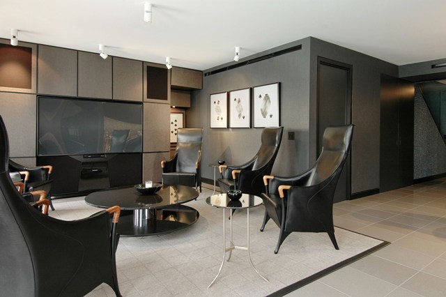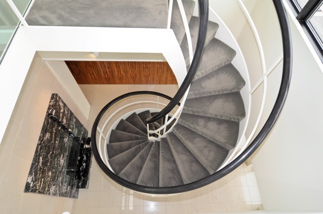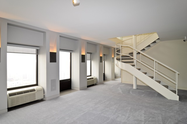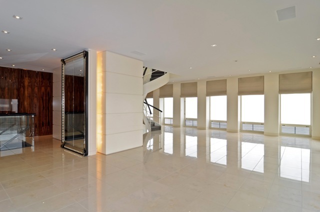 Lined floor-to-ceiling windows, the penthouse has four bedrooms, five-and-a-half baths, a media room, a smoking room and a recreational room. A cool, modern interior features custom mill and tile work, polished porcelain floors, a marble fireplace and an impressive spiral staircase. Above the main living space is a private solarium and a rooftop deck.