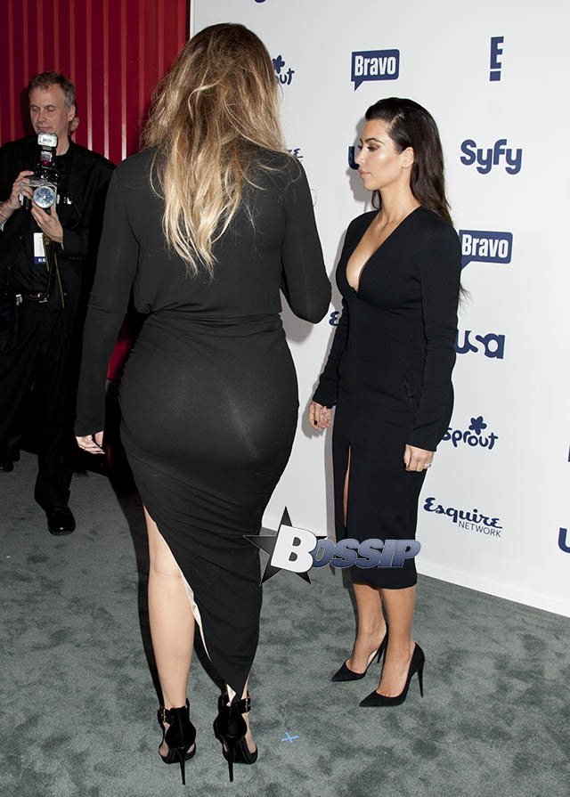 Last night was NBC Universal’s Upfronts where Kim Kardashian and her litte-big sister Khloe showed up with their CAKE game in FULL EFFECT!!! Perhaps it’s the angle, but “KoKo’s” larger than life donk is making “KiKi’s” look miniature. Hmmmmmm……