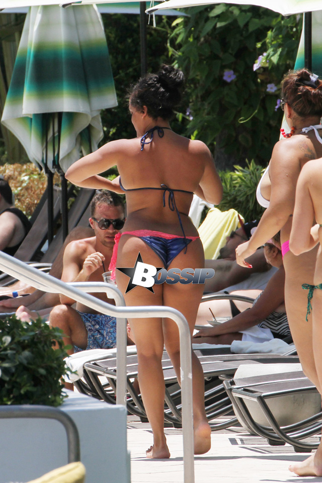 Natalie Nunn continued her Miami vacation with husband Jacob Payne and some girlfriends by laying out poolside. She spared us a little bit of crack by trading her thong for a lingerie-style ‘kini instead. You likey?